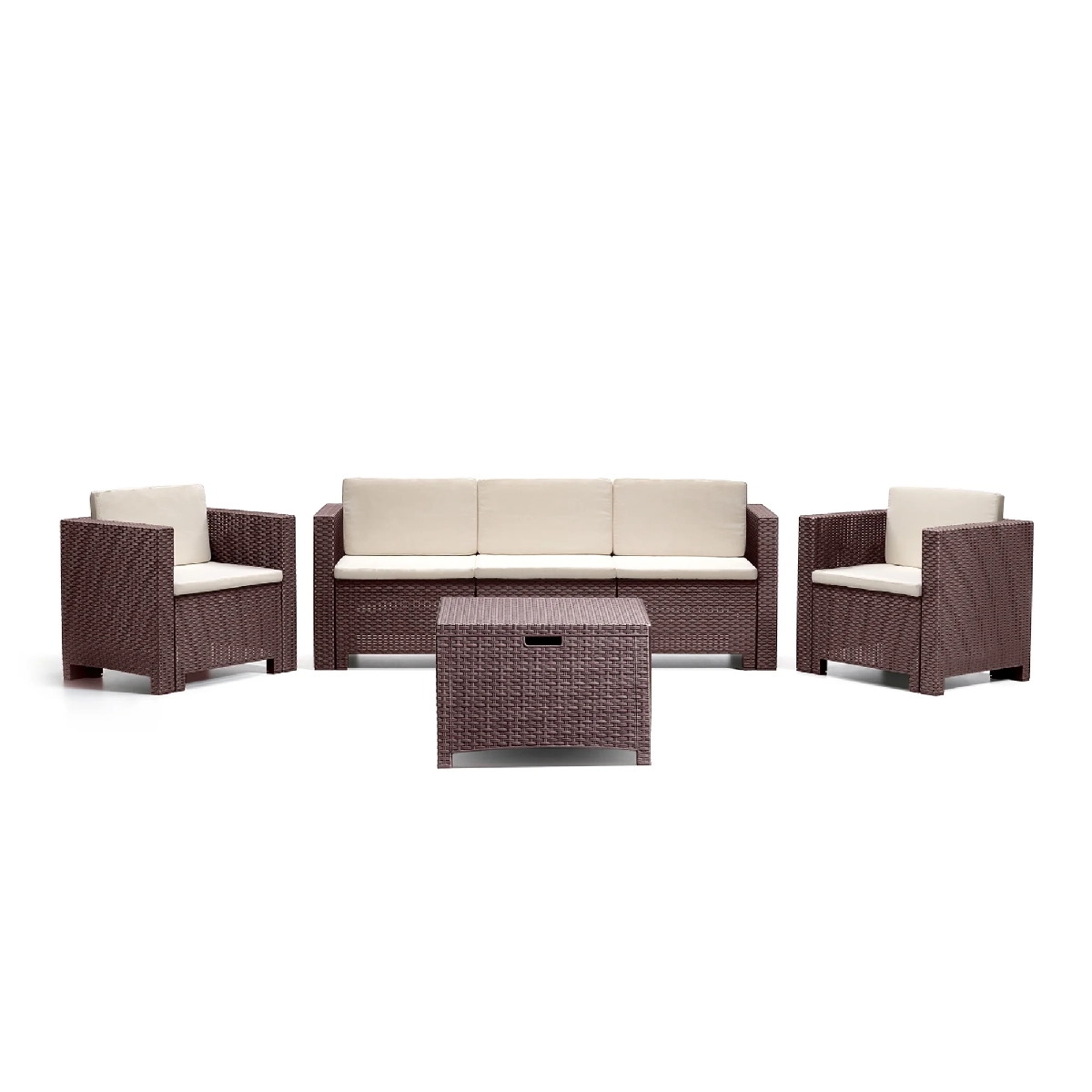 • Garnitura je izrađena od ratan finiša, sa vodootpornom, reciklirajućom smolom, što je čini izuzetno pogodnom za vanjsku upotrebu.
