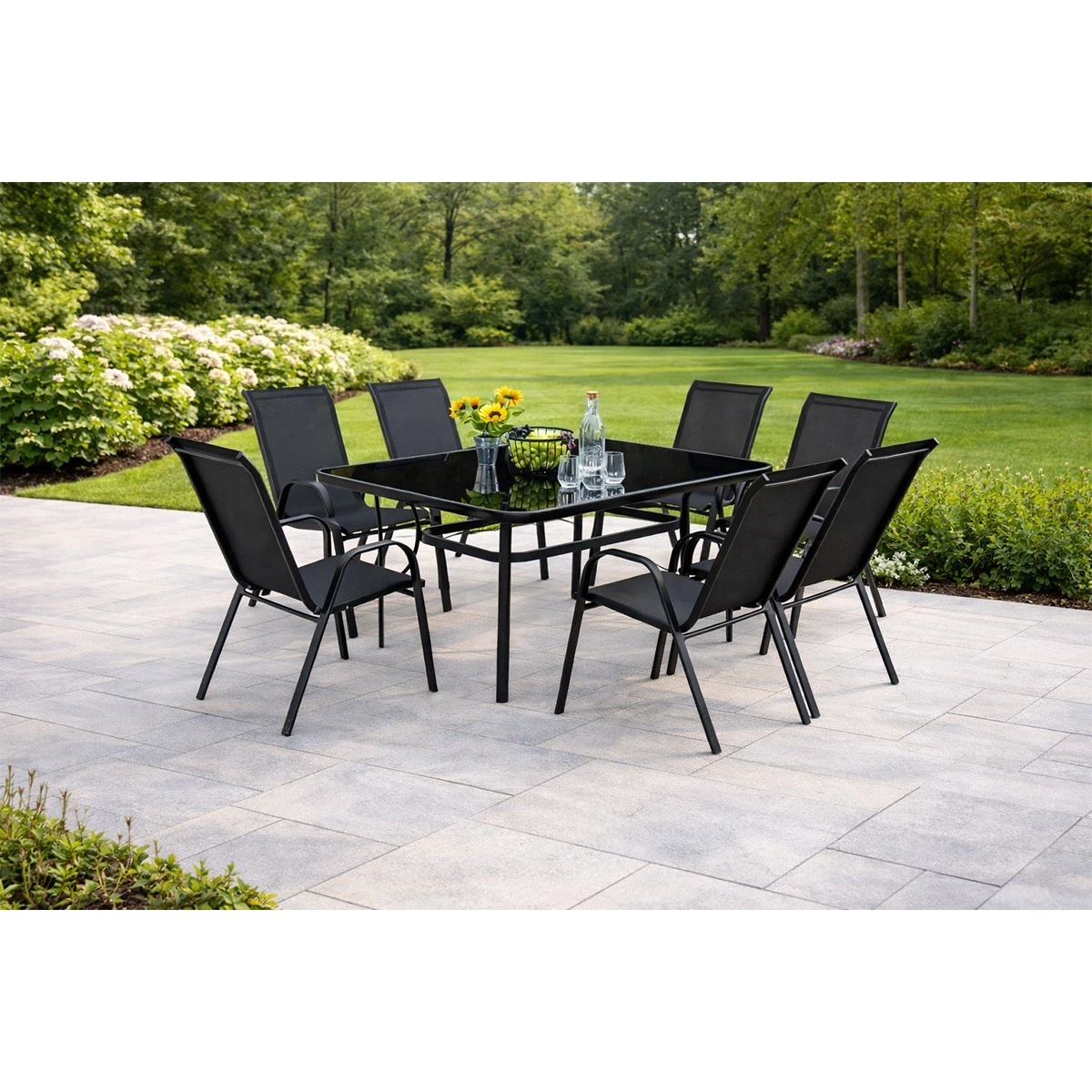 Set se sastoji od stola dimenzija 150 x 90  x 70  cm sa providnim staklom i 4 stolice 54 x72 x 90 cm
